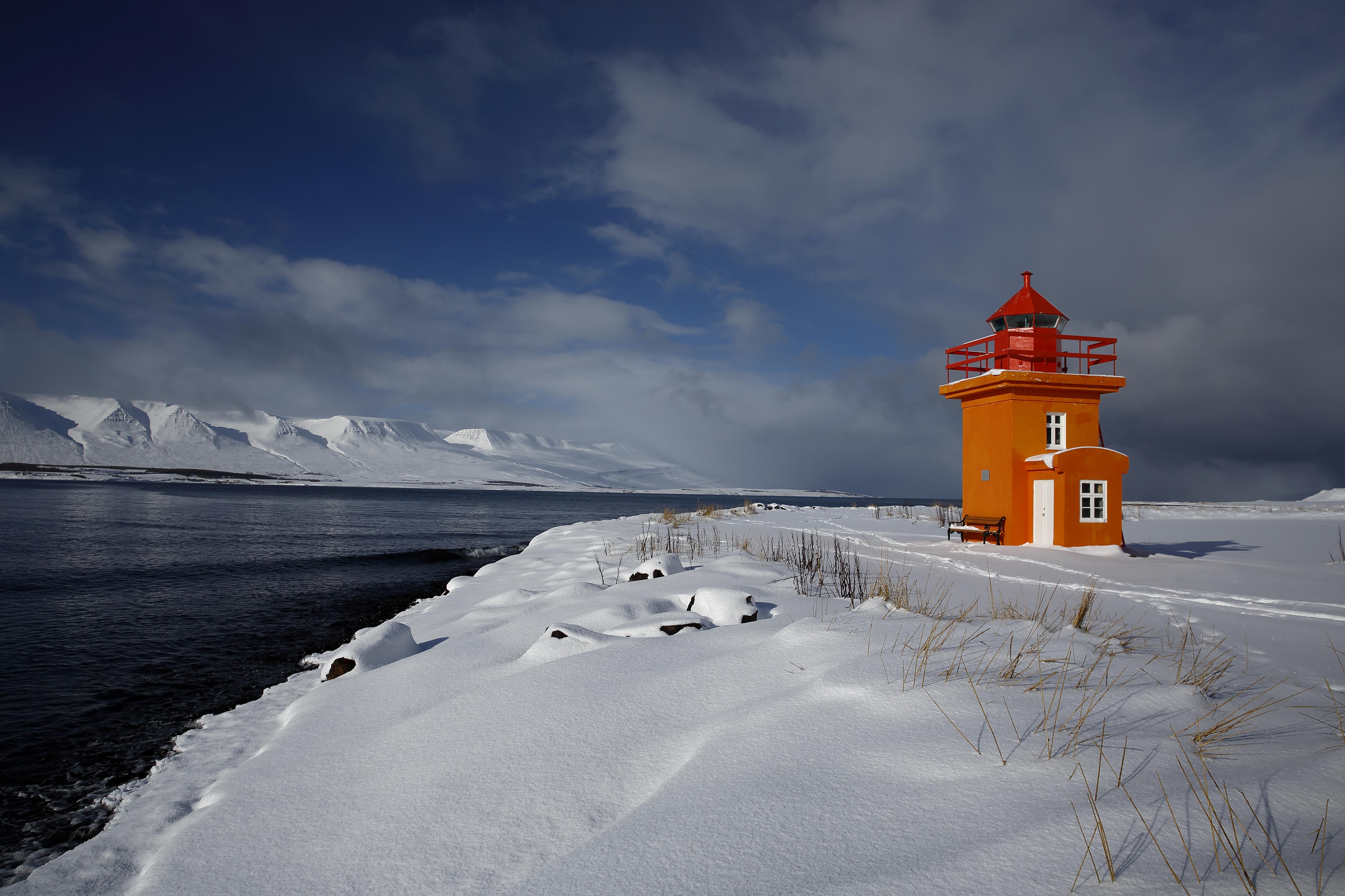Jednou z dalších zastávek je oranžový maják, který na zářivě bílém sněhu a výjimečně i pod rozzářeným sluncem vypadá opravdu majestátně. Pohoda slunečných paprsků ovšem netrvá moc dlouho. Utíkáme před blížícími se mraky zpátky do aut a jedeme dál.