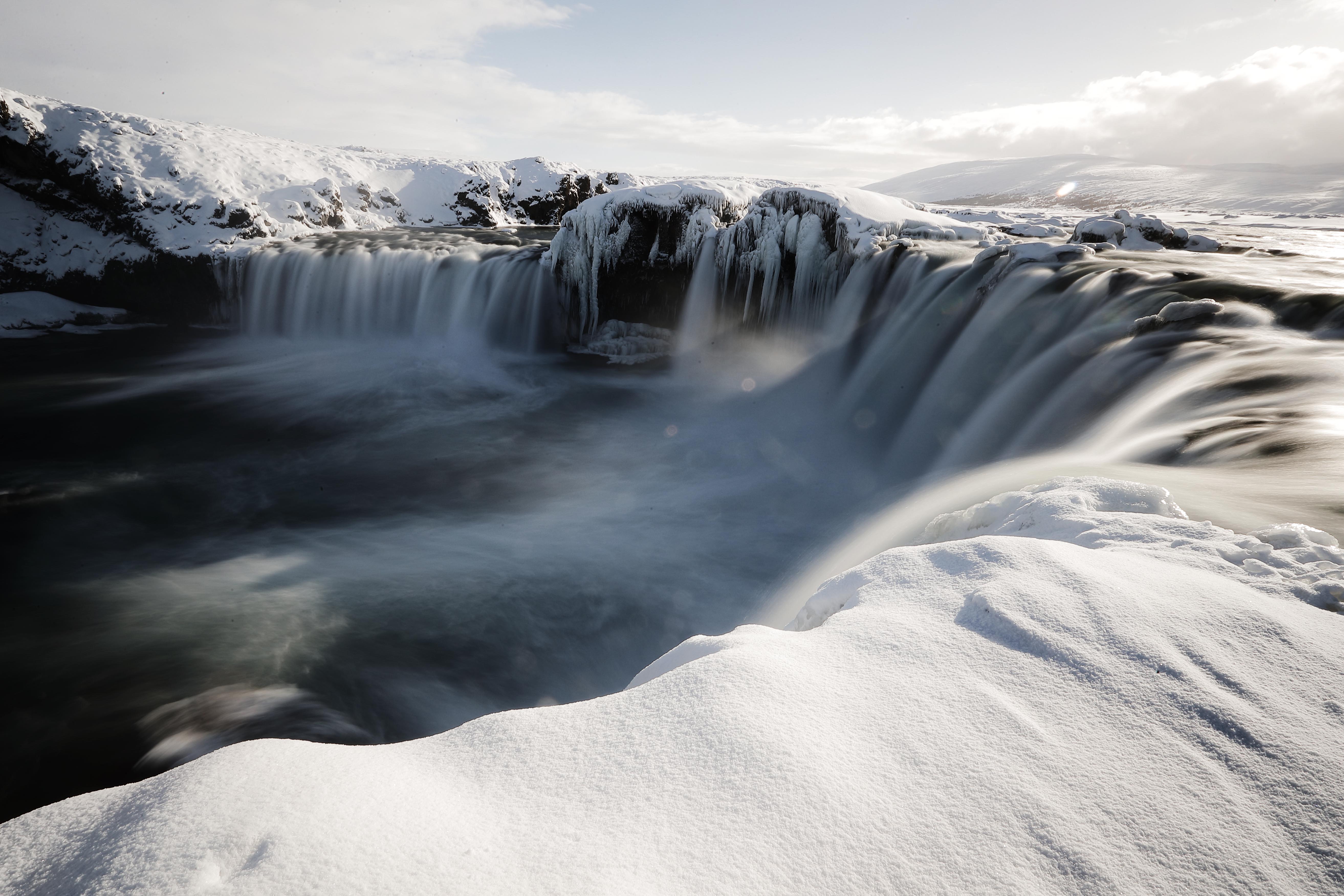 Cesta se klikatí víc a víc až nás dovede k hlavnímu cíli dnešního putování, vodopádu Godafoss. Kromě velkého množství japonských turistů nám nepřeje ani světlo, které vytváří silné kontrasty. Ale i tak se pokoušíme o nějakou tu fotku. Široký vodopád na cca 15s expozici dává vyniknout eleganci padajících copánků vody a ohromných rampouchů.