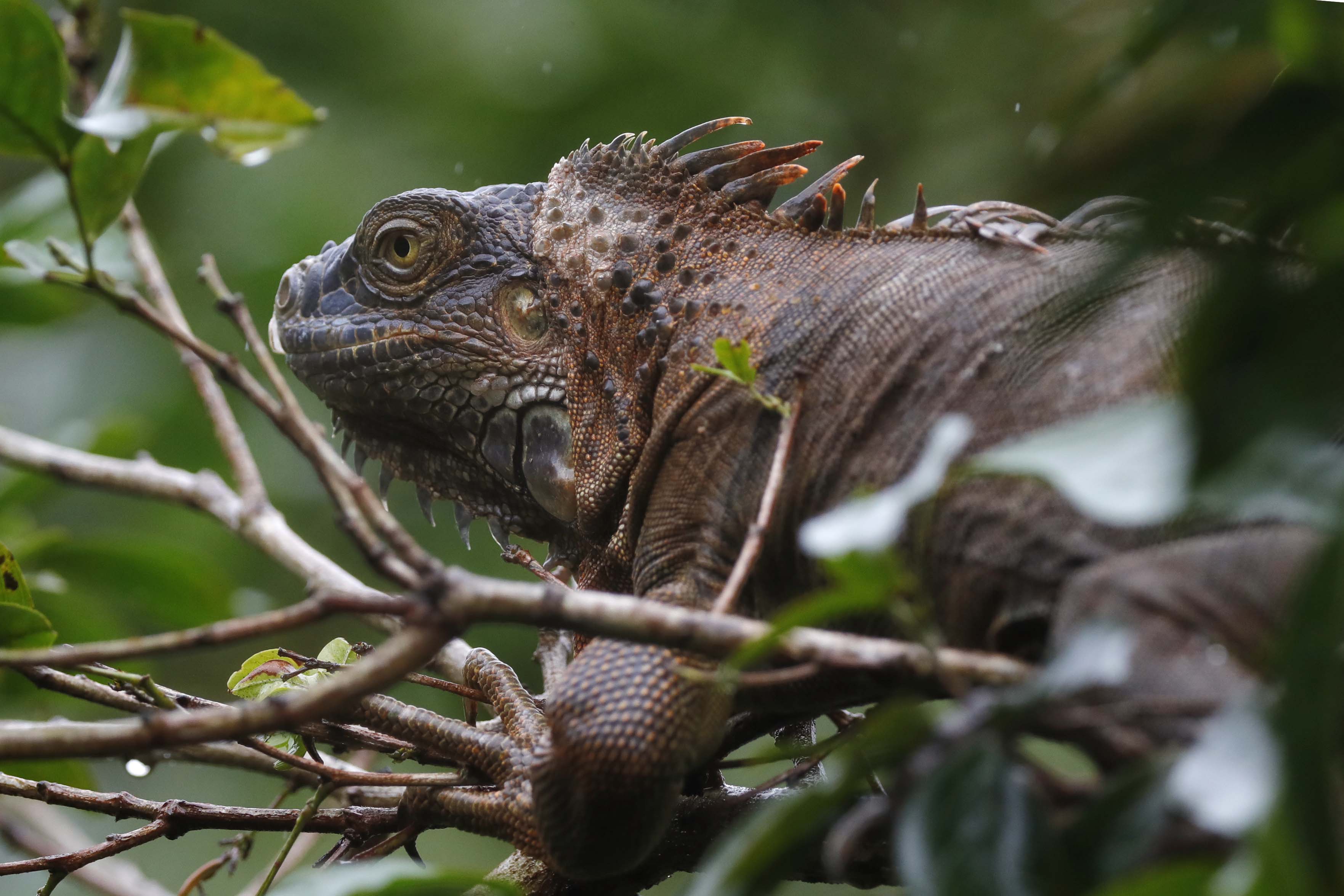 Poblíž místa, kde jsme zastavili na oběd, objevíme ve větvích odpočívající leguány. A tak se nám jídlo o pár snímků protáhne.