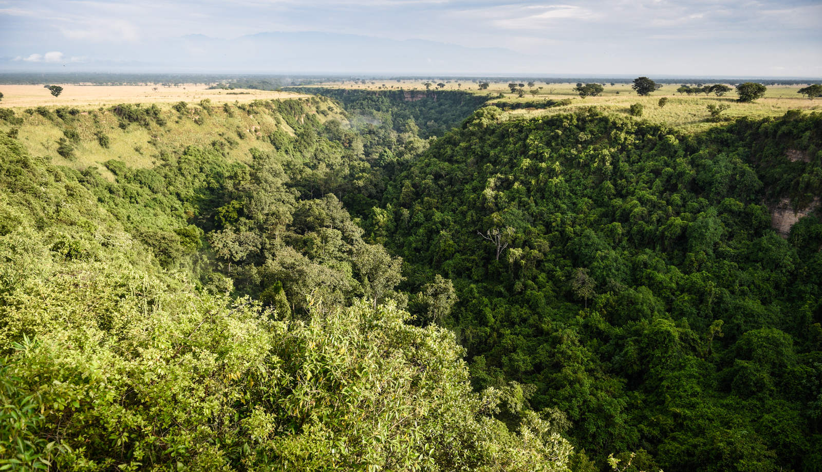 Kolem nás je pouze savana a nic nenasvědčuje tomu, že by poblíž měl být deštný prales, ve kterém šimpanzi žijí. Ani na místě není úplně jasné, kam vlastně půjdeme. Ale poté, co jsme došli k nedaleké vyhlídce, se před námi otevřela neuvěřitelná scenérie. Údolí opic, jak je rezervace Kyambura Gorge nazývána, je proláklina asi 1 km široká, ve které se v hluboce 100m pod povrchem klikatí říčka Kyambura. A v této proláklině na 26 km2 se nachází zmíněný deštný prales.Vysoká vlhkost a uzavřenost údolí z něj dělá ideální místo pro šimpanze a další opice, hrochy, pralesní slony a mnoho druhů ptactva.