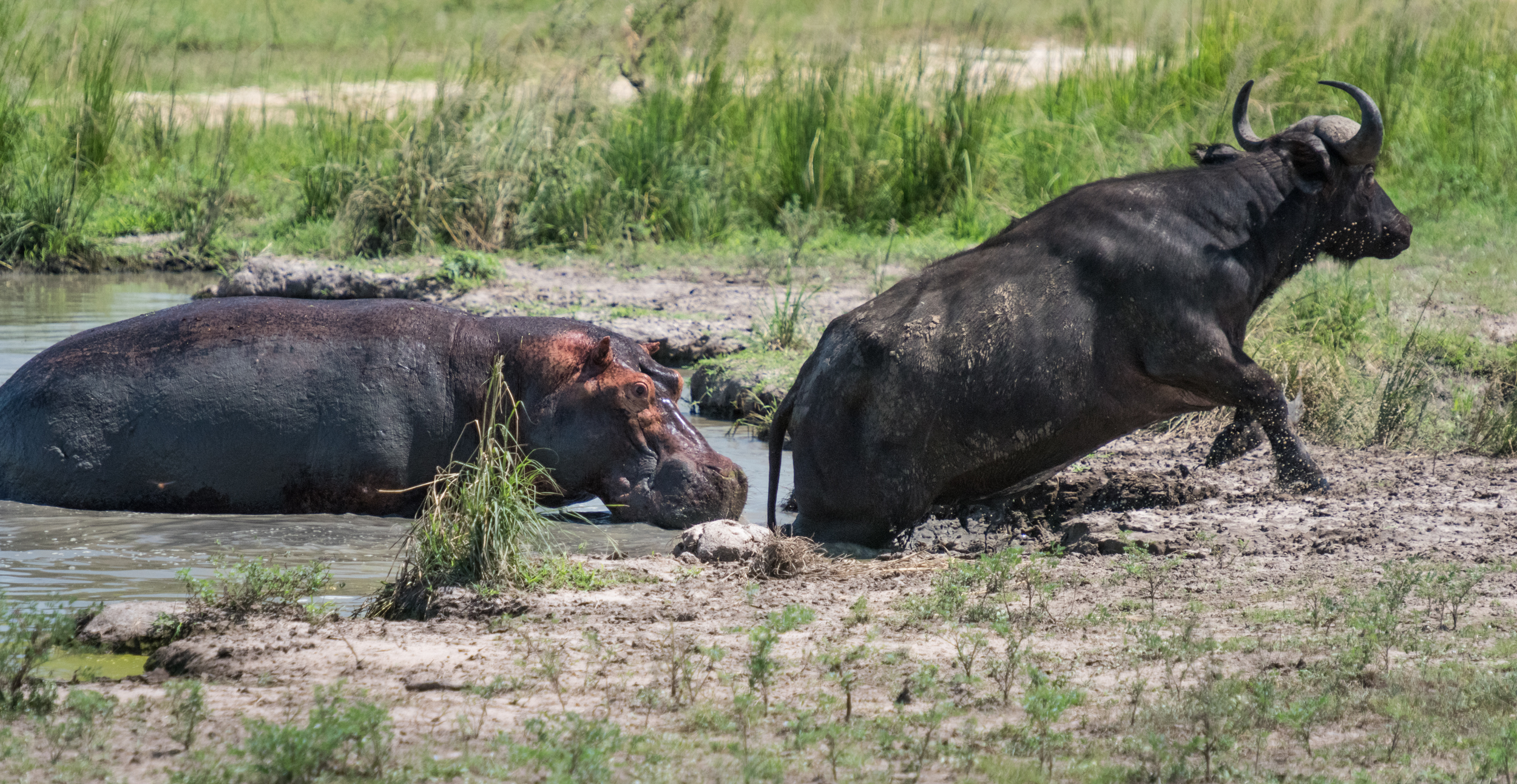 Když jsme se žiraf dostatečně nabažili, pomalu se proplétáme až k Nilu, kde narážíme na přírodní "bazének", ve kterém si nerušeně lebedí hroch společně s buvolem. Po našem příjezdu jako by hroch chtěl ukázat, kdo je tady pánem a buvola neomaleně vyžene z vody. V takových chvílích už nejde jen o fotografie, ale i neopakovatelné zážitky (tím si omlouváme všechny situace, které jsme přes úžas nebyli schopni pořádně nafotit ;)).