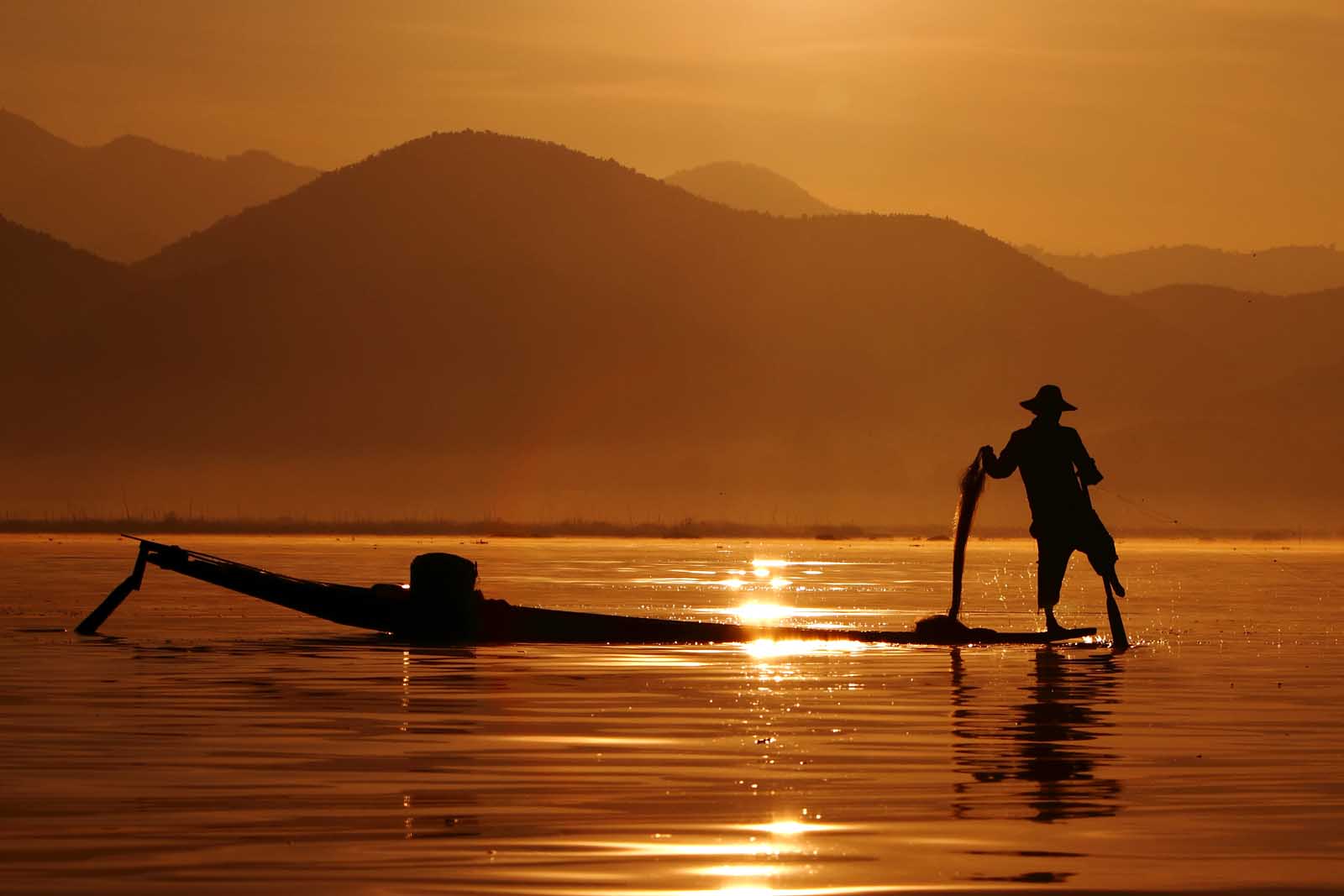 Inle Lake, Barma Rybář v ranním světle lovící ryby ještě typickým způsobem pro toto jezero - pádluje nohou. Zpět do galerie Autor František Mazáč Autorský poplatek za m2 200 Kč s DPH Motivy Barma , Lidé a Street , Asie Barvy Oranžová Vytvořit fotoobraz