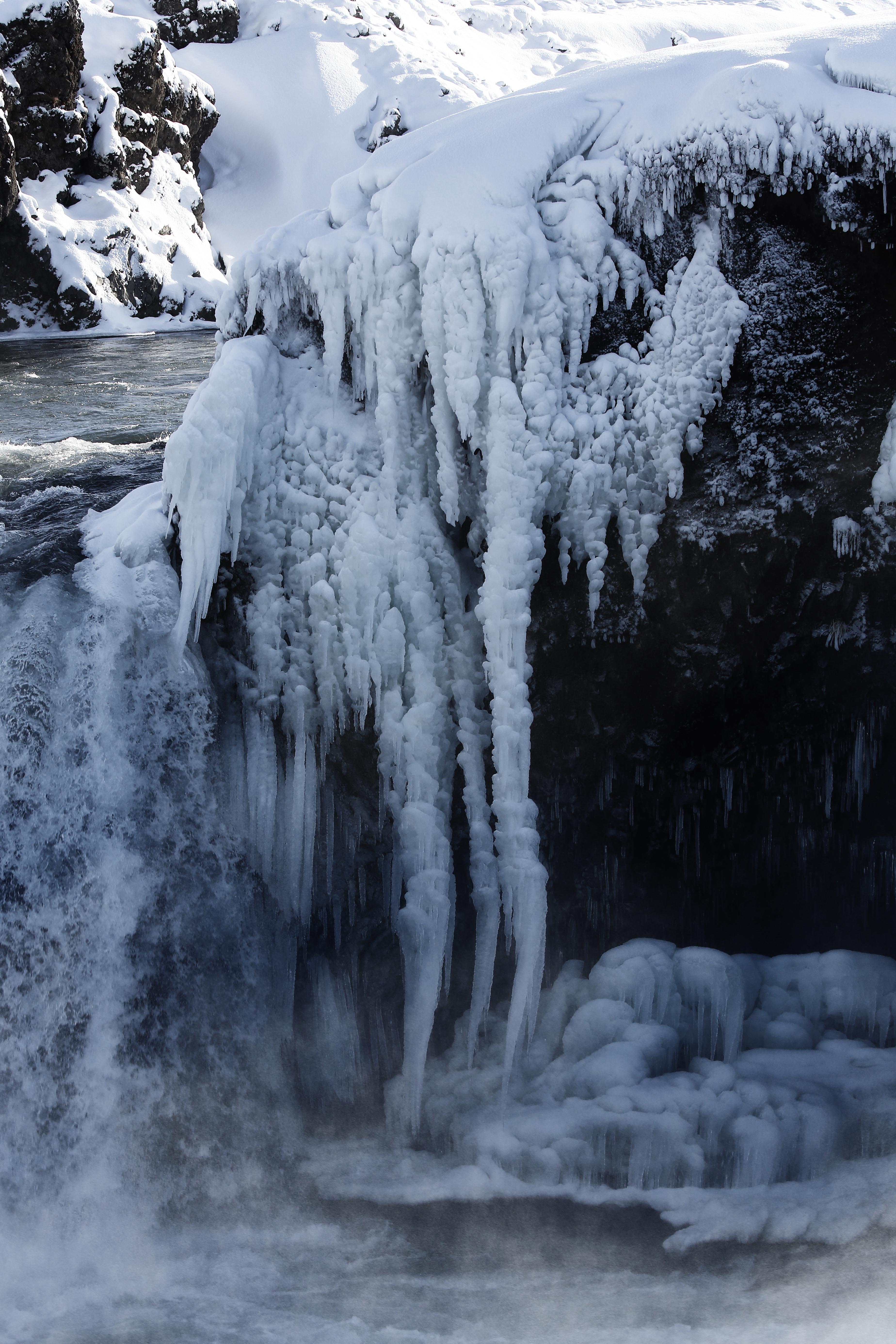 Cesta se klikatí víc a víc až nás dovede k hlavnímu cíli dnešního putování, vodopádu Godafoss. Kromě velkého množství japonských turistů nám nepřeje ani světlo, které vytváří silné kontrasty. Ale i tak se pokoušíme o nějakou tu fotku. Široký vodopád na cca 15s expozici dává vyniknout eleganci padajících copánků vody a ohromných rampouchů.