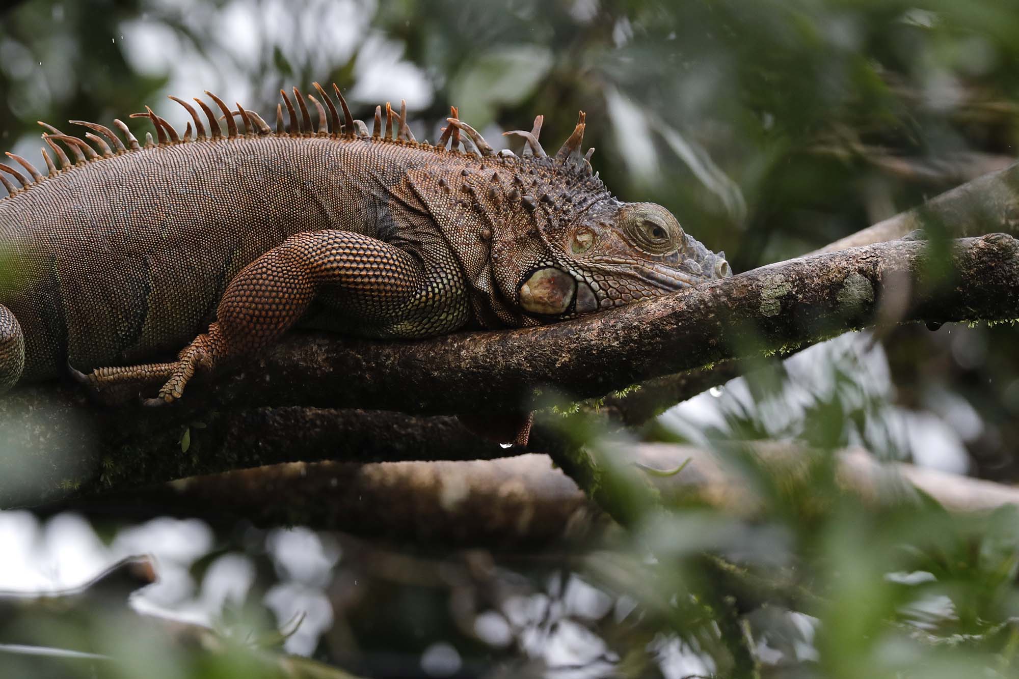 Poblíž místa, kde jsme zastavili na oběd, objevíme ve větvích odpočívající leguány. A tak se nám jídlo o pár snímků protáhne.