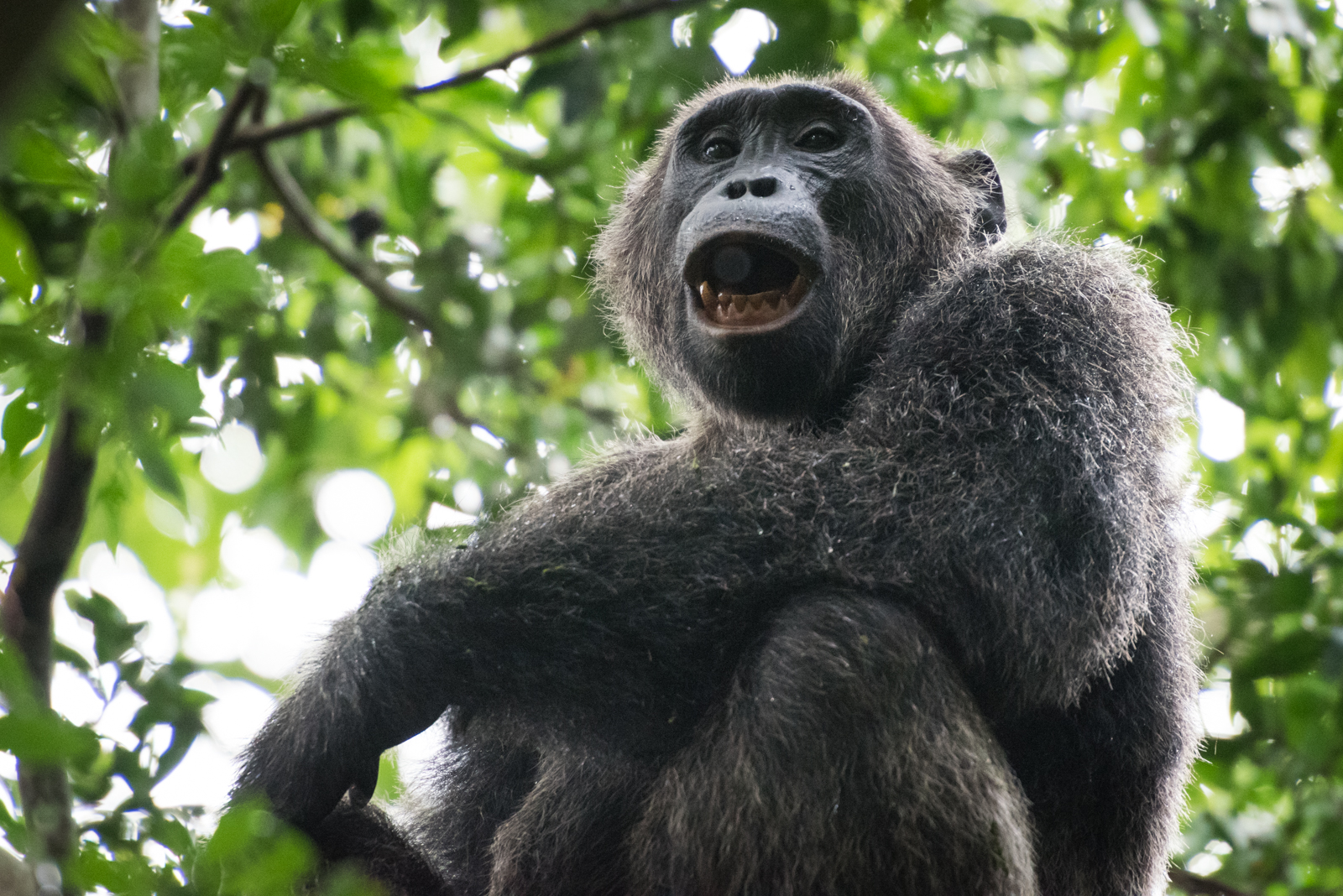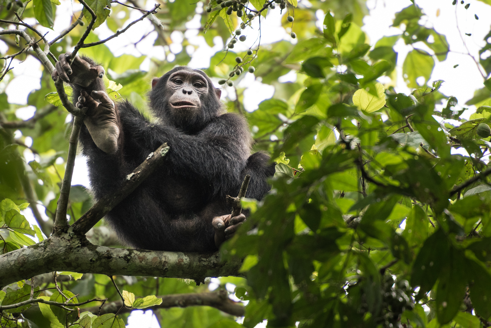 Po dalších 20 minutách jsme konečně u cíle. Nastává nám již známá fáze nahánění toho nejlépe postaveného šimpanze. Jelikož jsou velmi aktivní a akční, občas focení připomíná spíše terénní běh. Podmínky jsou ovšem lepší, než v prvním případě. Světlo je rozptýlené, šimpanzi jsou blíž a vstřícnější. Ovšem jen do chvíle, než se rozhodnou si s námi hrát tak, že po nás začnou házet celé větve. Nakonec nás ale odmění tak, že ze stromů slezou na zem a nechají se fotit z nějakých 5 metrů.